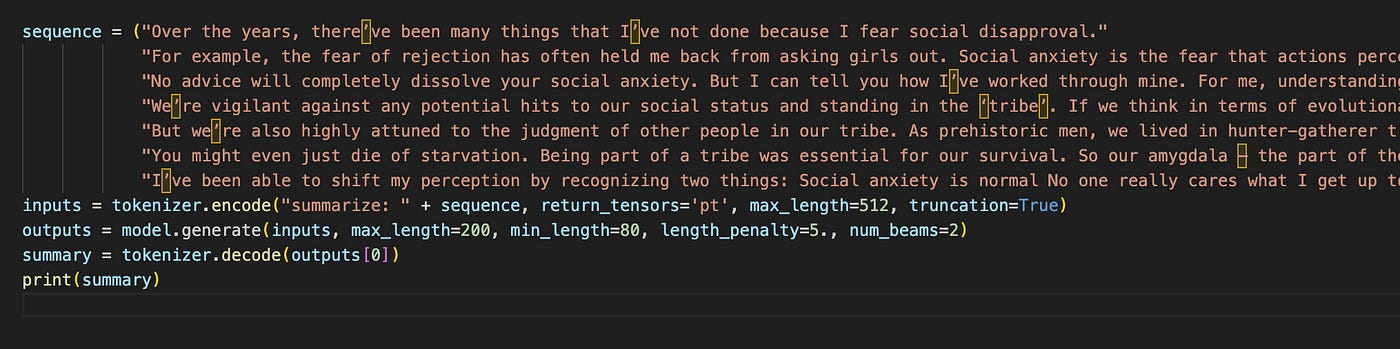 that contains the input text that you want to summarize. In this case, we can copy and paste the text from a resource around social anxiety. Then, we call in the encoder to match the process of "summarize: "